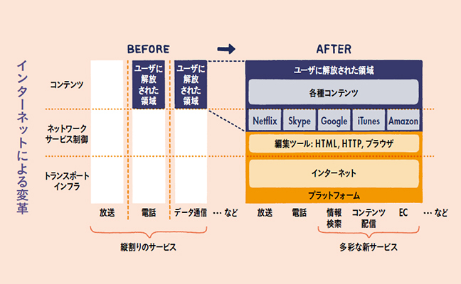 2010年代に入ったころから急速に普及を始めたスマートフォン。従来の携帯電話にはなかったバラエティ豊かなアプリ・サービスが生まれますが、その背景にはインターネットの技術がありました。従来の携帯電話と比べ高い処理能力を持つスマートフォンでは、スマートフォン自身で高度なプログラムを動かす事ができ、また、直接インターネット上のサーバと通信が行えるようになったのです。また、スマートフォンは、プラットフォームが世界共通になったという事も大きな出来事の1つです。海外で始まったSNSが日本でも定着し、インターネットの新しい使い方が広がりました。メールのような1対1のコミュニケーションと、ホームページのような意識的な情報発信の中間のような形で、特に宛先なく気持ちをつぶやき、そしてそれを見たどこかの誰かが「いいね」を返す、そんな緩やかなつながりがインターネットを通して世界を覆うようになりました。