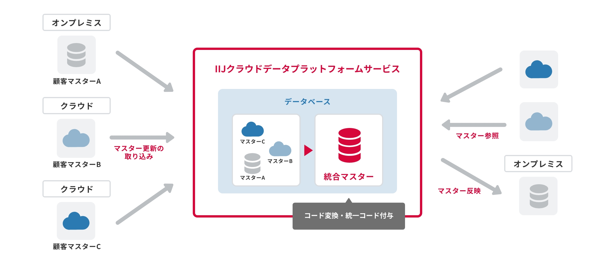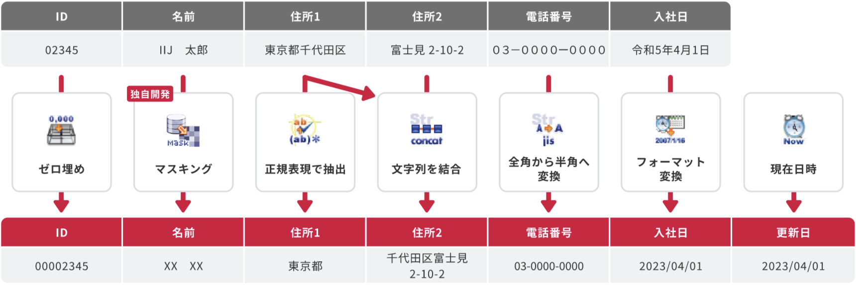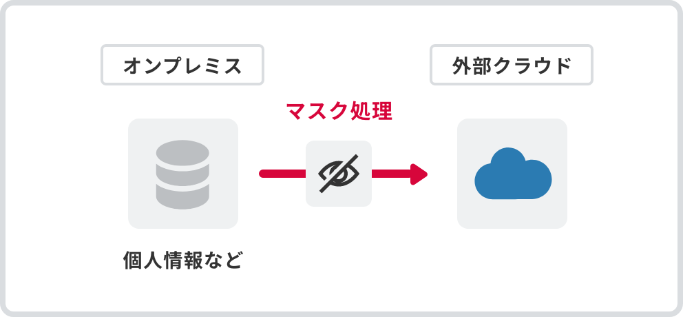オンプレミスに保持している機密性の高いデータをクラウドへ安心・安全に連携する機能も備えています。IIJ独自開発の「データマスキング」はデータの参照整合性を維持したまま、データにマスクをかけて秘匿性を高めます。個人情報などの機微データも安全に取り扱えます。