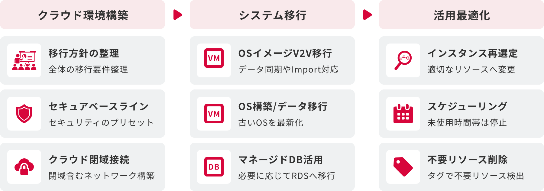 VMware環境で稼働中の既存アプリケーションに影響を与えない方法で移行を行い、AWSならではの基本セキュリティ設定を適用。更に、移行後のリソース最適化までを一貫して対応します。