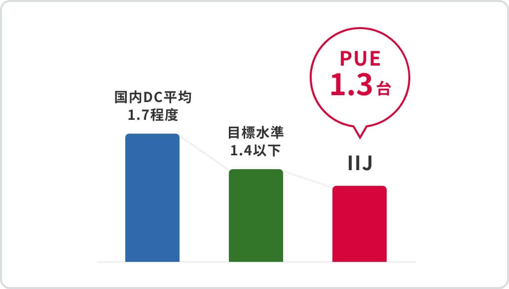 カーボンニュートラルの実現に早くから取り組み、PUE1.3台を達成しています(自社データセンターの実績)。