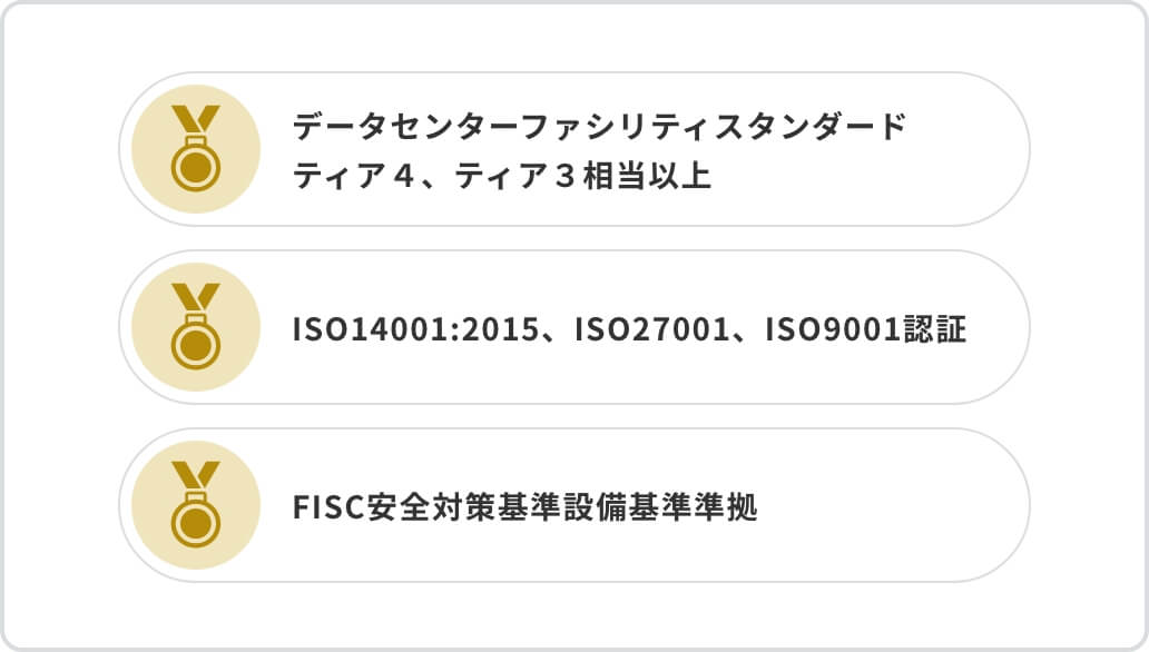 国内データセンターはいずれも「データセンターファシリティスタンダード」の最高位「ティア4」または「ティア3」相当以上に適合。情報セキュリティや品質に関する国際規格にも対応しています。