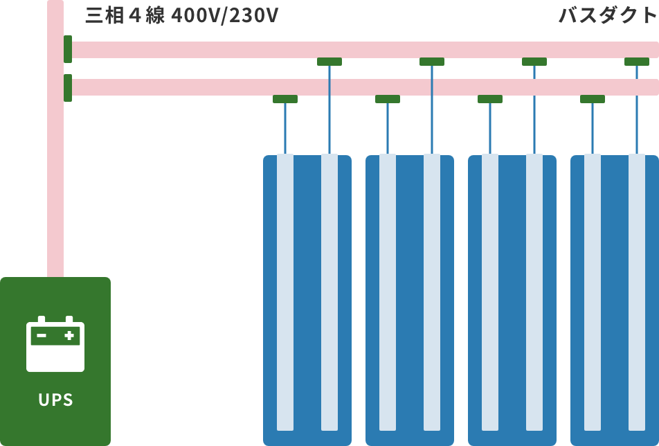 変圧ロスを軽減して給電効率を上げる三相4線式UPSを採用しています。