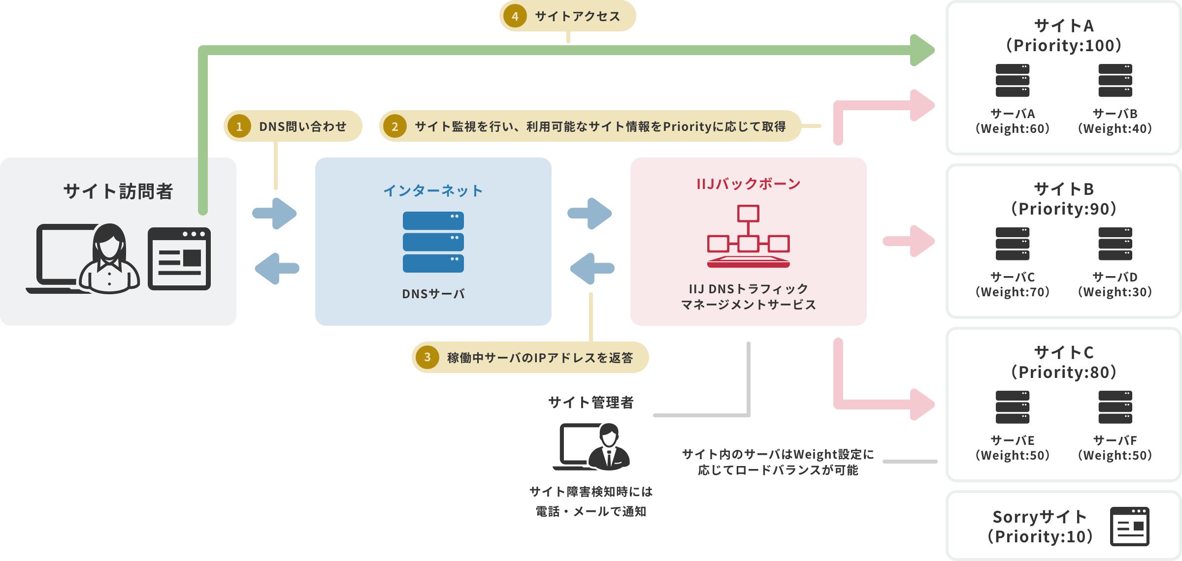 お客様のWebサーバ群を常時監視し、メインサーバがダウンした場合は、稼働中の予備サーバのIPアドレスをサイト訪問者に返答します。