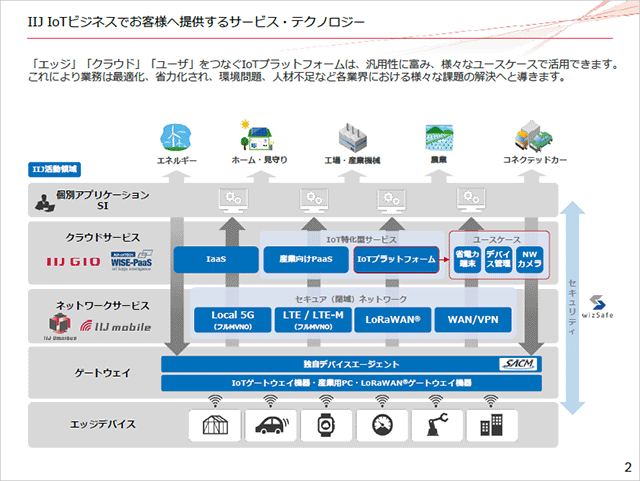 また、デバイスとIoTプラットフォームはIIJの閉域ネットワークで接続。通信データはセキュアに保たれます。 -