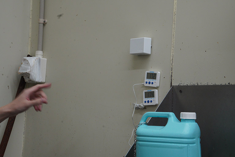 食品加工場の壁面に設置された温度センサー