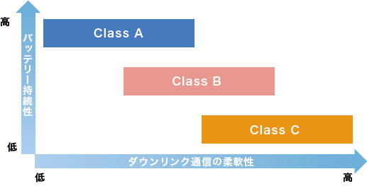LoRaWAN®では、消費電力とDownlink通信の柔軟性に応じて、3つの通信方式(クラス)が用意されています。
