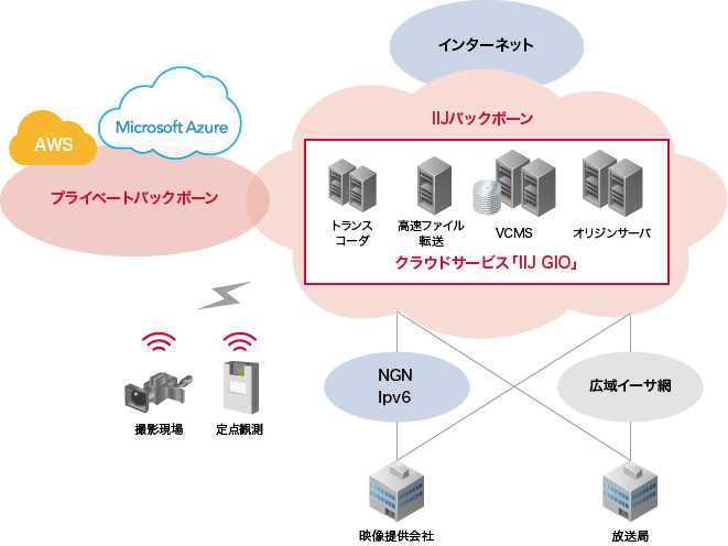 IIJ GIOサービスではAWS/Azureとの閉域接続が可能となります。帯域確保かつセキュアで安定的な通信環境で映像伝送、集信が可能となります。