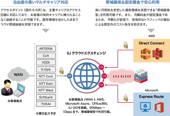 - 多くのユーザのトラフィックが集中する輻輳の起こりやすい設備を経由しない、低遅延でセキュアな通信環境を低価格で実現します。