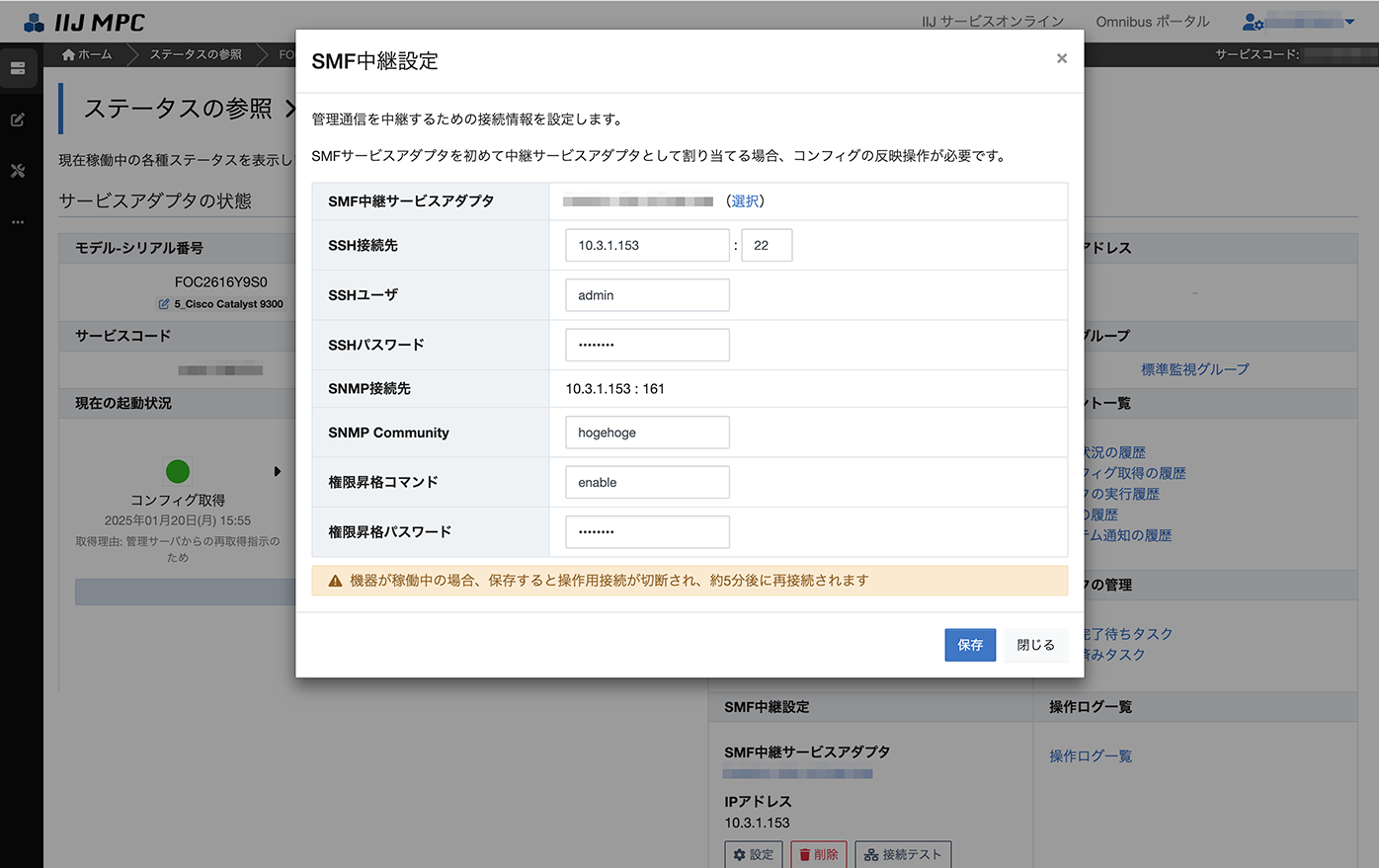 | サービスアダプタ モバイルアクセスオプション: 通常 |