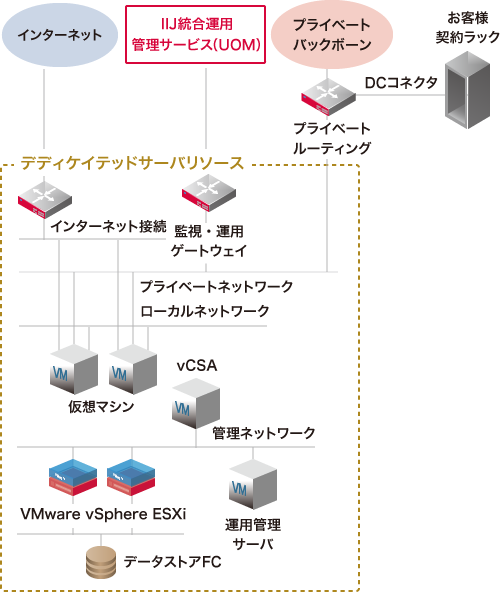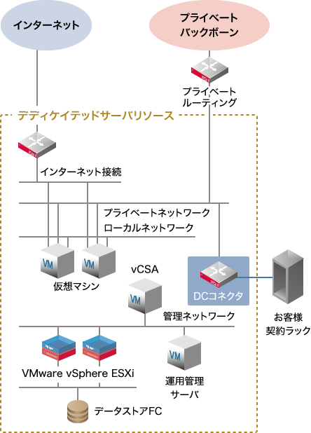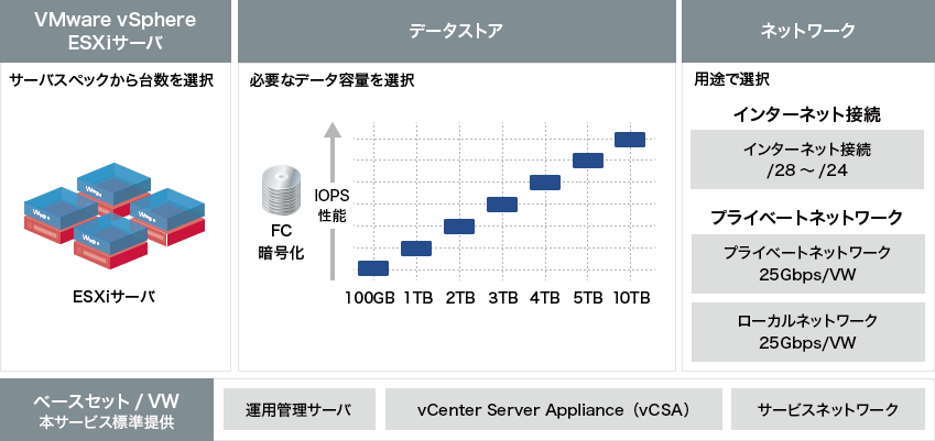 - ハイパーバイザーVMware vSphere ESXiがプリインストールされた専有サーバで提供します。