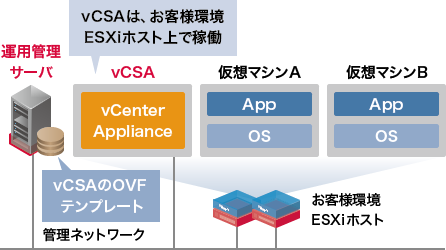 - VMware vCenter Server Appliance(vCSA)のOVFテンプレートを運用管理サーバのローカルディスクに格納して提供します。お客様環境へのvCSAのデプロイは、お客様に実施いただきます。