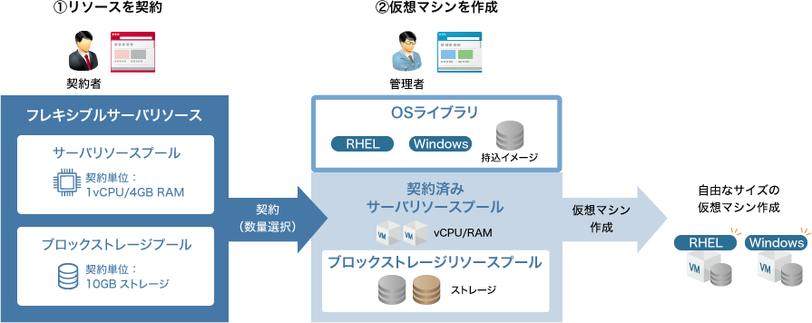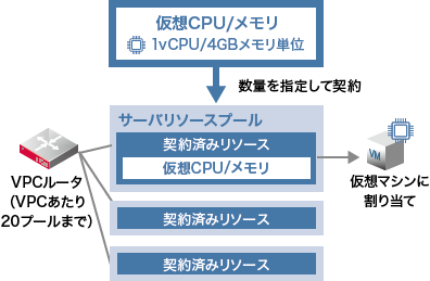 - 1vCPU/4GBメモリ単位でリソースプールを契約します。リソースプールのサイズは変更できます。
