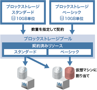 ブロックストレージプールは、仮想マシンのストレージとして割り当てるブロックストレージです。スペックの異なる2種類のブロックストレージから選べます。