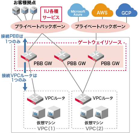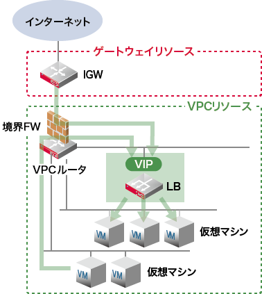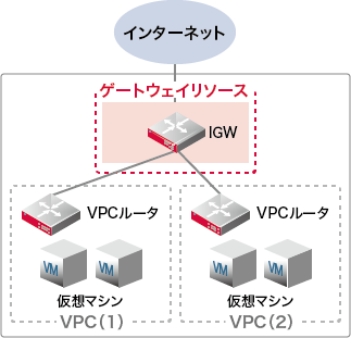 - すべてのゲートウェイがVPCルータと接続するため、仮想マシンはルーティングをVPCルータに集約できます。