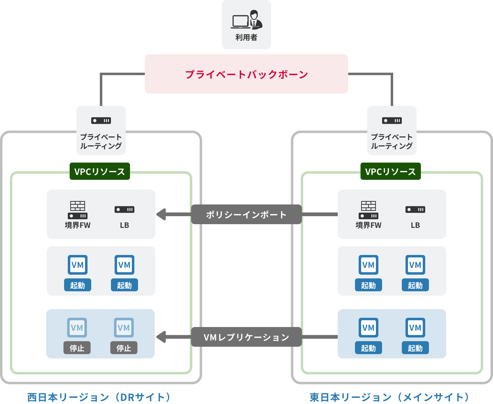 - プライベートルーティングを組み合わせて利用することで、DR切り替え時にメインサイトと同じIPアドレスでDRサイトのレプリケーションサーバに接続できます。