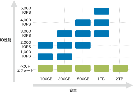 - ※性能保証タイプは記載の最大性能値を保証するものではありません。なお、最大性能の半分まで優先的にIOPS値を利用できます。