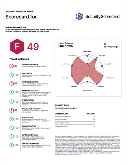 IIJ Safous Security Assessmentは、米国を拠点とするSecurityScorecard社©が提供する、アタックサーフェス監視と脅威情報に基づいたリスク評価プラットフォーム「SecurityScorecard」によるサービスです。