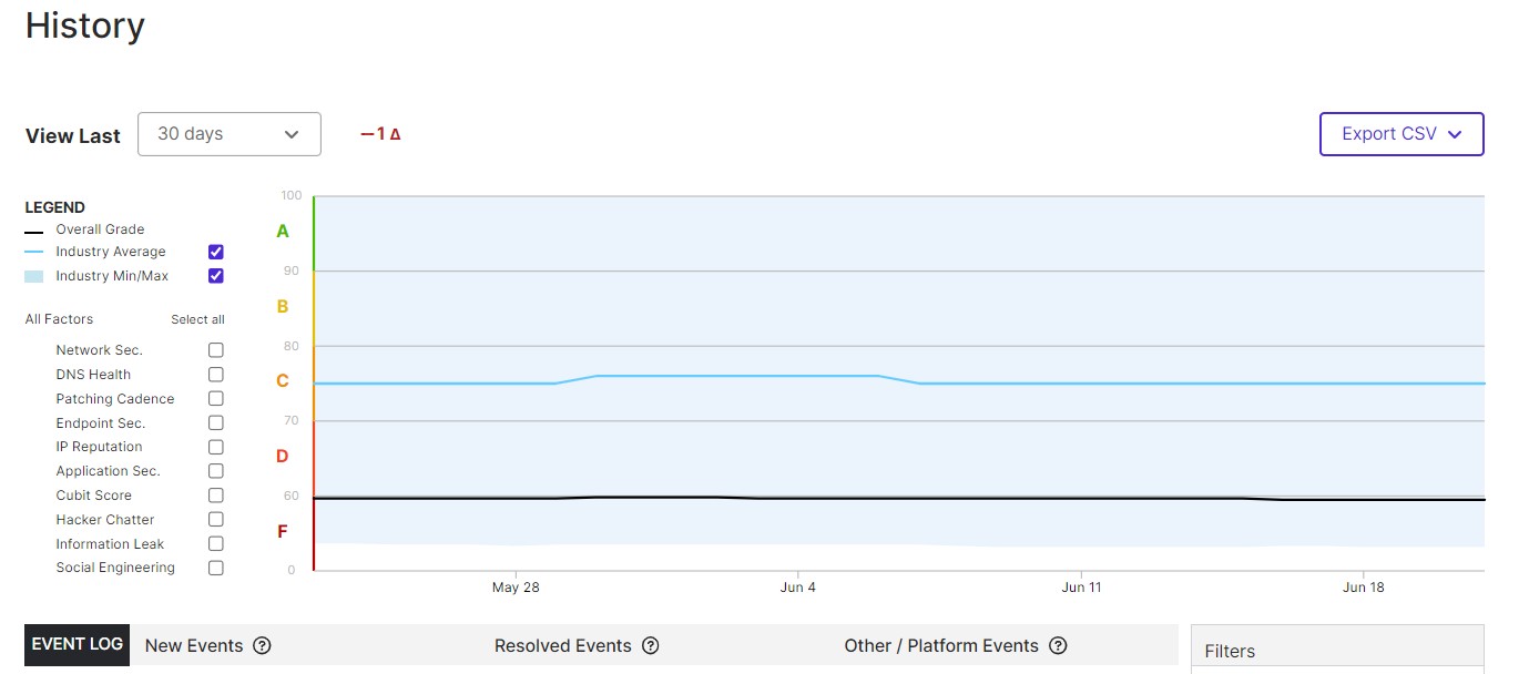サイバーリスクレーティングの変化を定常的に監視してサイバーリスクを可視化。レポートは、A〜F及び100点満点で評価し、外部から見たお客様環境のセキュリティ状況を、定量的にスコアリング及びランク付けを行います。