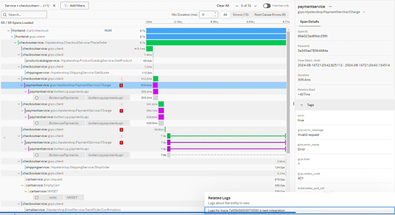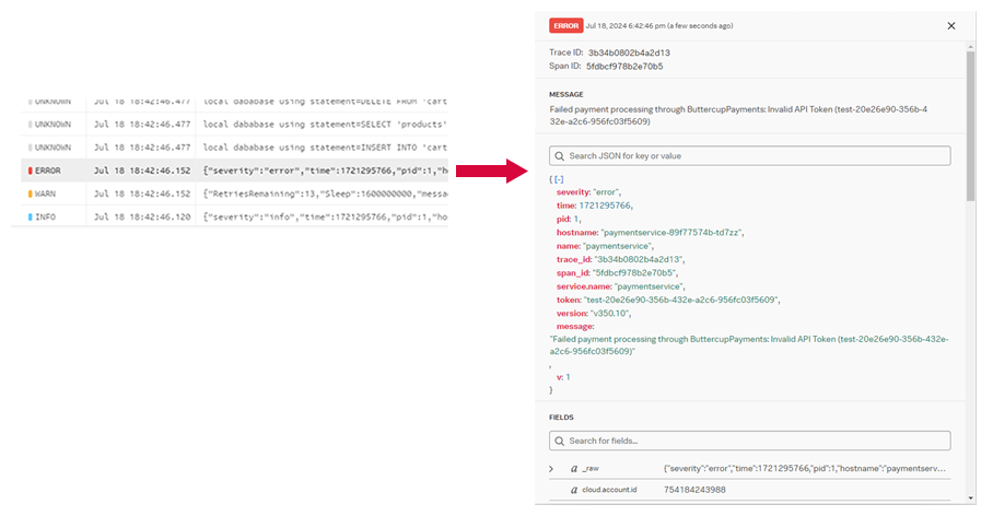 また、関連するログやインフラリソースを合わせて確認できるため、原因が容易に特定できます。