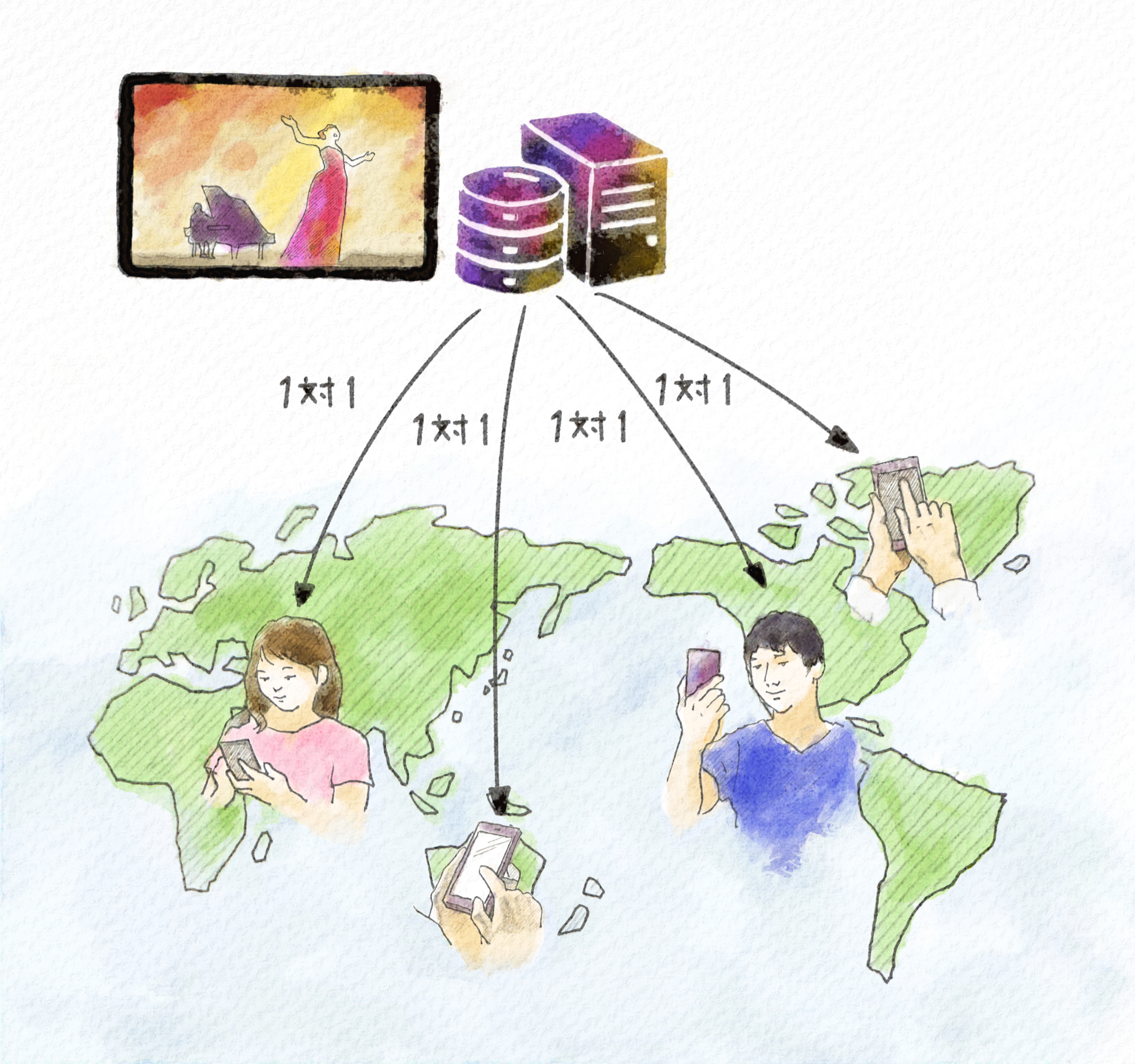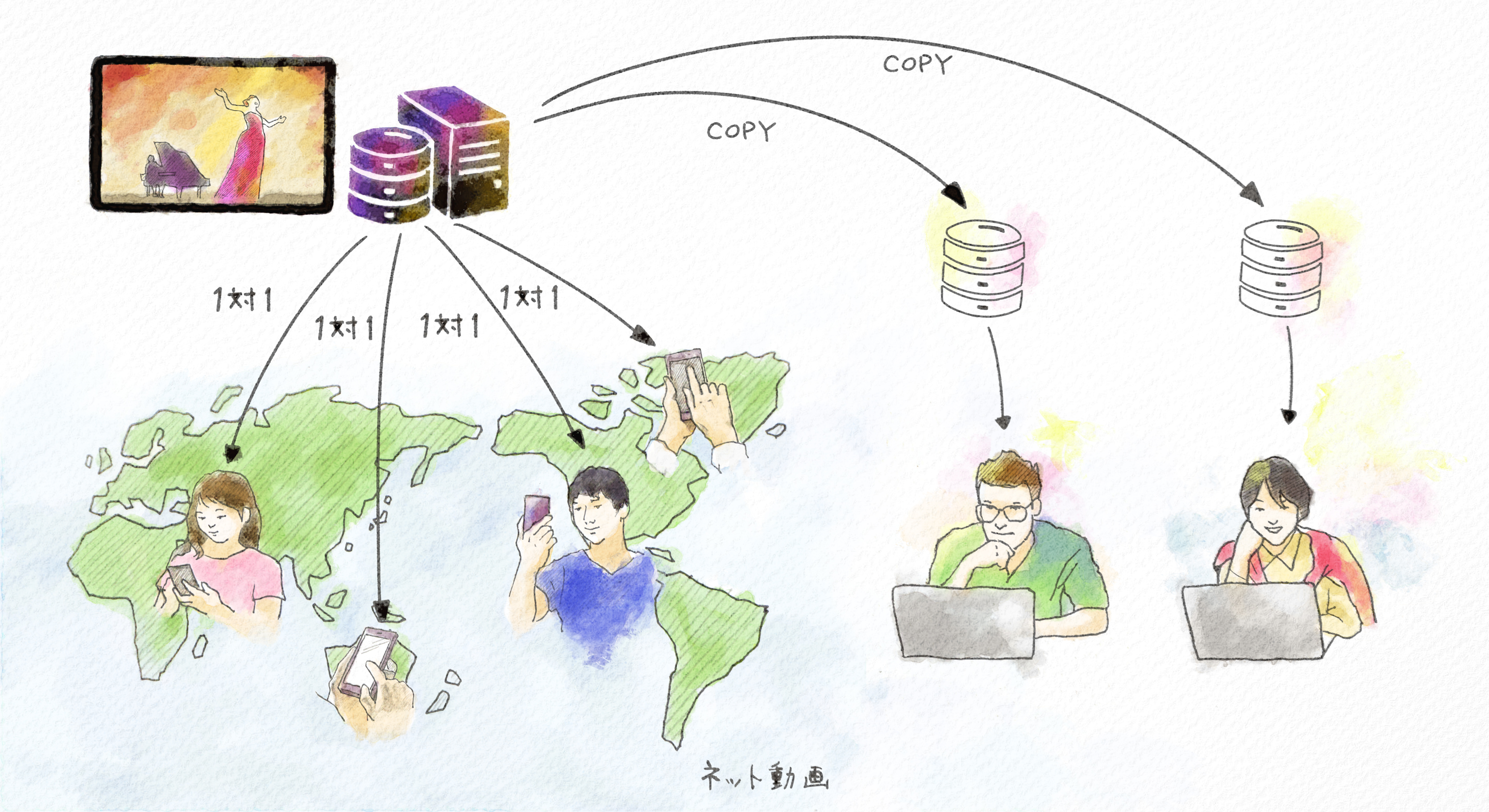 一方ネット動画では、動画のデータはインターネットにつながったサーバから送られてきます。そして、この仕組みはテレビと違って「一対一」の関係です。ネットで同じ動画をたくさんの人が見ていた場合でも、この仕組みは同様です。一万人の人が見ている場合は「一対一」の関係が一万人分ということになります。
