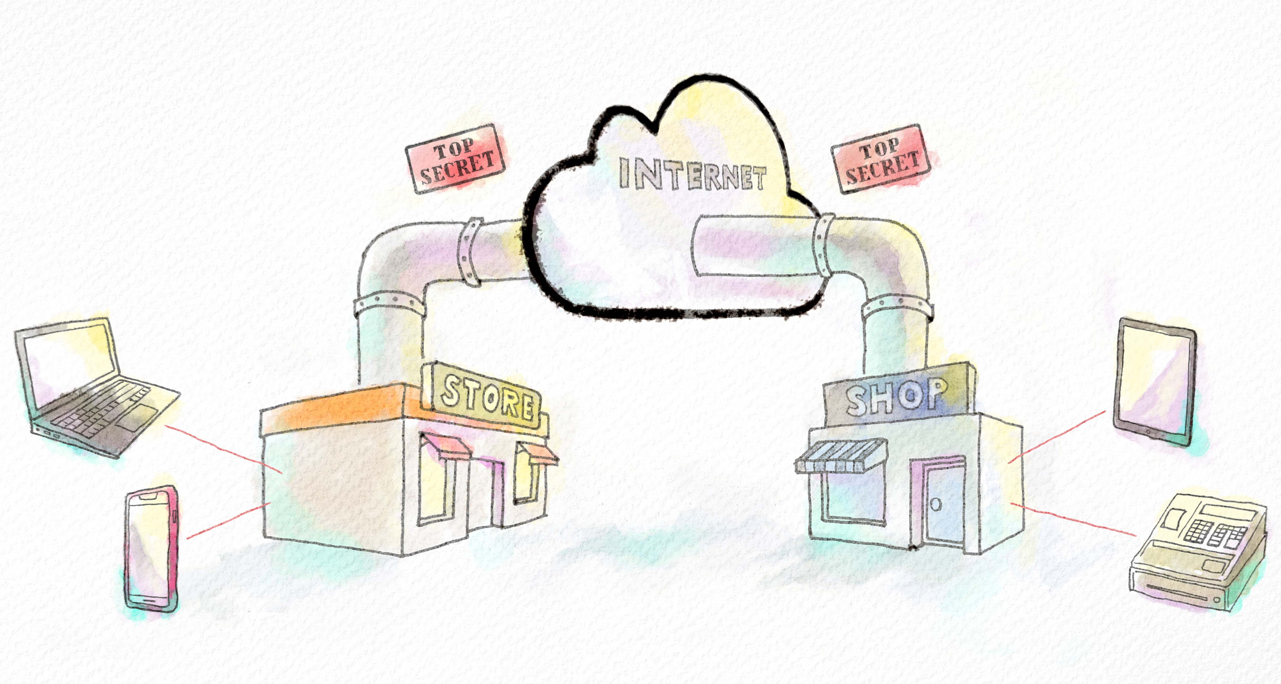 簡単に言うと、データを送る時に暗号化して鍵をかけ、データを受け取ったら、対になった鍵で暗号化を解除する仕組みです。これにより、あたかも専用線を使っているように、他者からは「見えない」通信が実現できているのです。