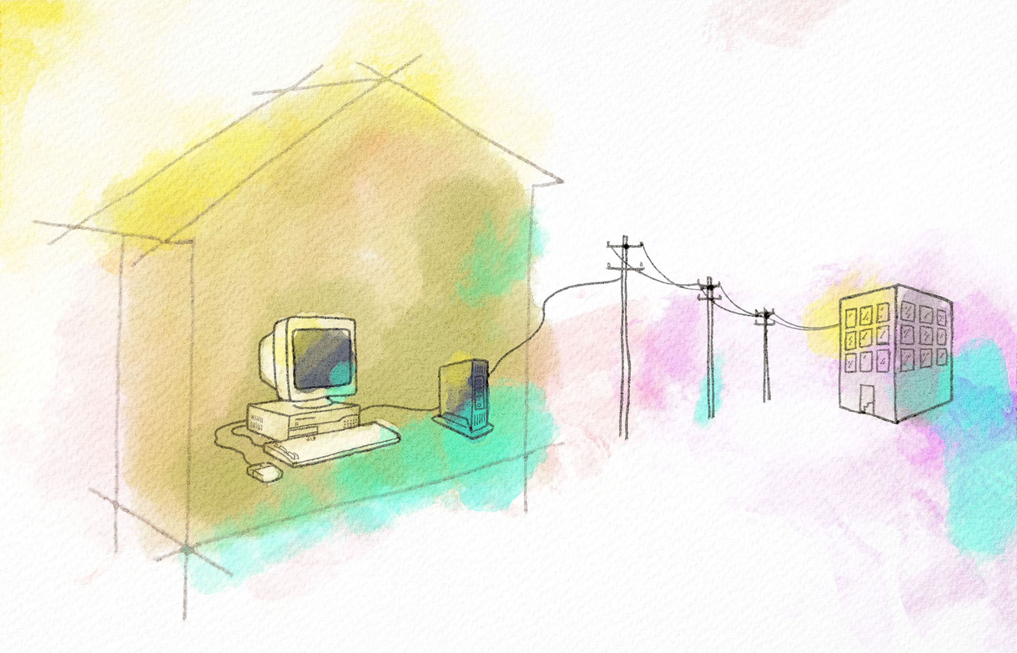 インターネットを利用するには、データを送受信するための回線が必要です。しかし、インターネットが日本に普及しはじめた1990年代には、個人が使えるインターネットの専用回線はありませんでした。そこで、家庭や小規模なオフィスの多くは、すでに広く普及していた電話回線を利用していました。