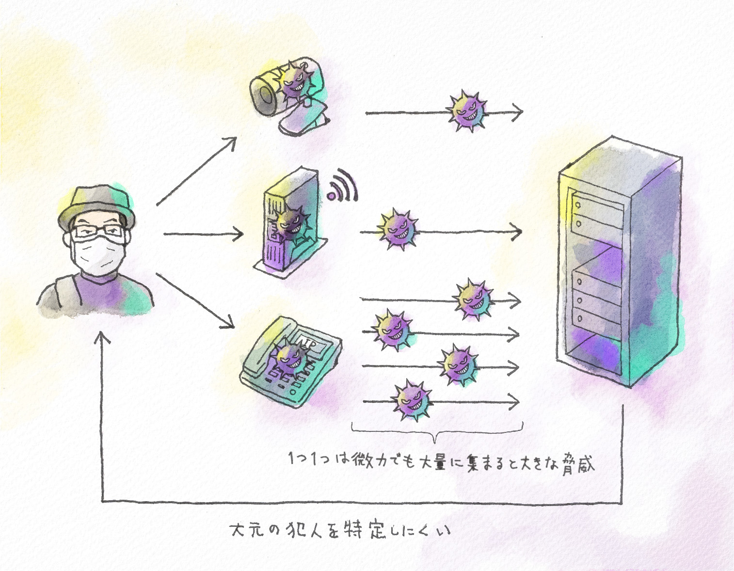 Miraiは、近年人気のウェブカメラやWi-Fiルータなどの「IoT機器」に感染し、遠隔操作を可能にします。 1つ1つの機器は単純な構造なので、感染してもその脅威は微かなものですが、これを数百万台同時に制御することで、巨大な力を生みます。その力はターゲットのサーバを、制御不能にできるほどです。そして、膨大なIoT機器を隠れ蓑にしているため、犯人特定が難しいという特徴もあります。