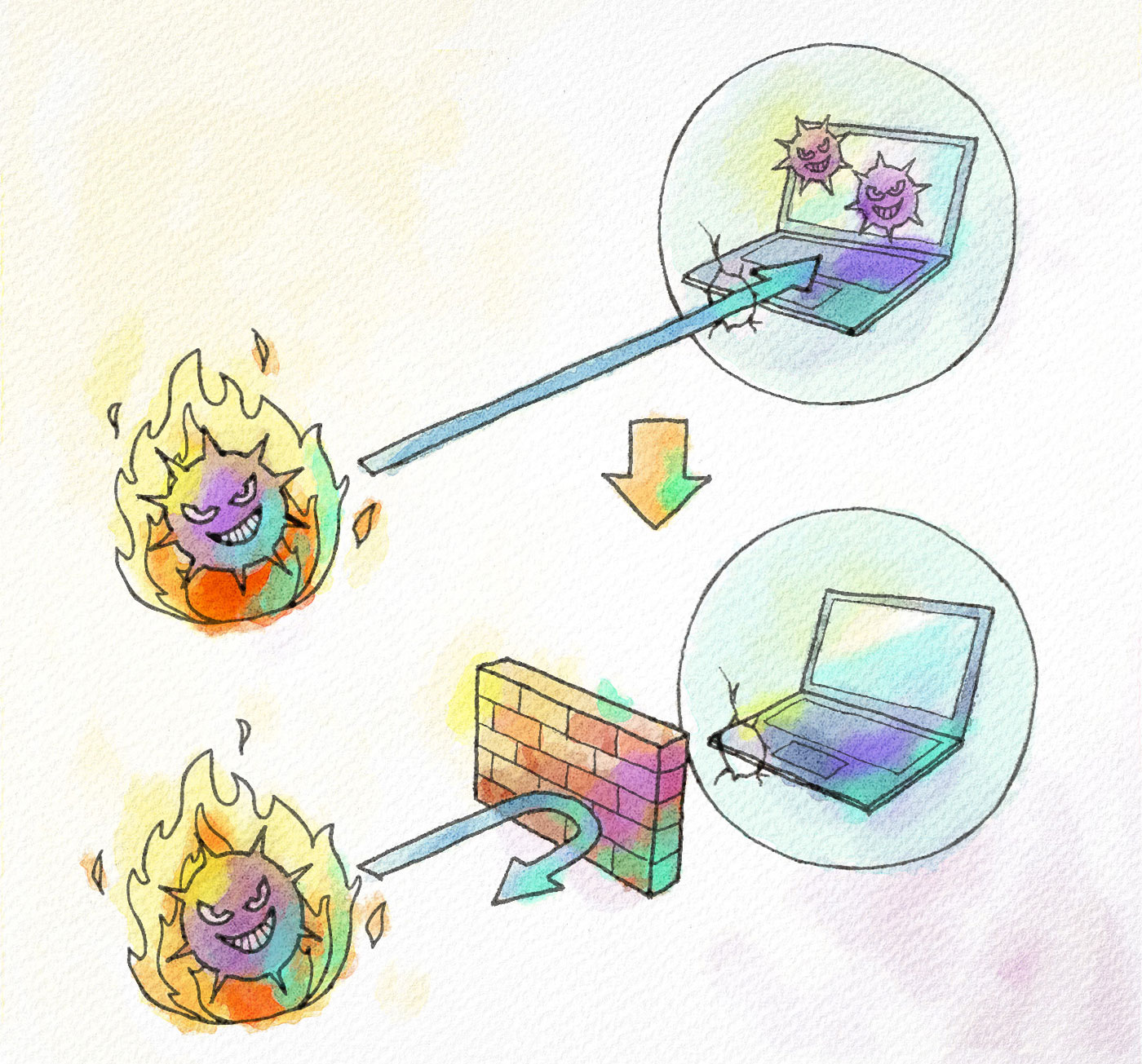 当時のコンピュータには、ある程度のセキュリティ対策は備わっていましたが、欠陥はどうしても存在していました。攻撃者はそこを狙って、インターネット経由で他人のコンピュータに入り込み、遠隔から操作したり、情報の盗み見を行ったりするようになりました。そこで、この欠陥を防御する壁「ファイアウォール」が誕生します。