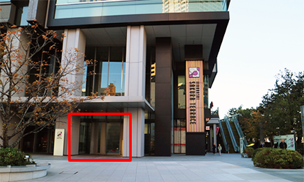 - (1)交差点を渡り、広場を直進。オフィス棟の正面口から入館。