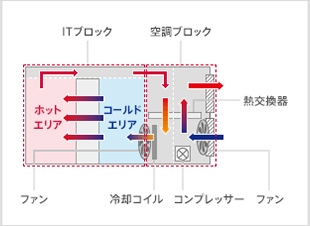 図は、ITモジュールを3連結した12ラック構成です。UPS、空調とも冗長化されデータセンターに必要なファシリティを一体的に提供します。電力は、ラックあたり実効10kWまで利用できます。