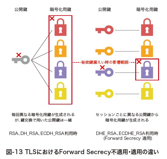 一方で、毎回同じ公開鍵を用いて暗号化されているケースでは、一旦暗号化されたデータが広域ネットワークを通して伝播されている場合、暗号通信が何十年という単位で長期間に渡って記録され続けていて、将来のいつか秘密鍵が漏えいすることにより、過去に遡って復号できてしまいます。Forward Secrecyはこの問題を防ぐ技術として注目されています。