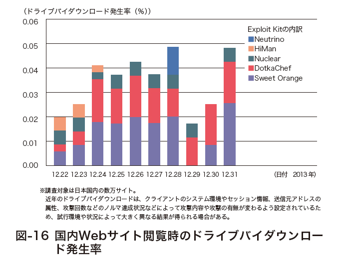 2013年12月22日から31日の観測結果をまとめたものが図-16です。縦軸がWebサイト閲覧時のドライブバイダウンロード発生率を百分率で示し、更に、その内訳をExploit Kitの種類ごとに色分けしています。