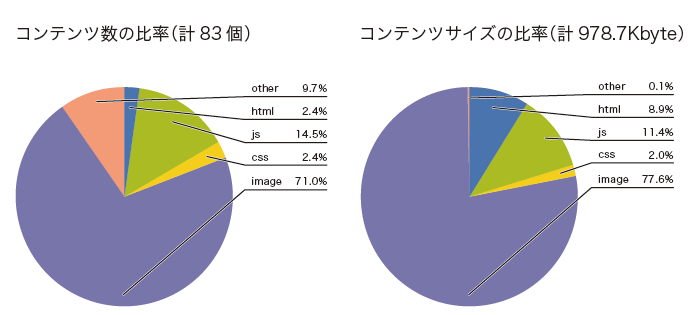 最近のWebトラフィックの量が把握できたので、次に、このWebトラフィックにはどのようなコンテンツが含まれているのか見ていきます。図-1のトップページに含まれていたコンテンツを、コンテンツタイプごとに分類し、コンテンツタイプの比率を図-2に示しました。左の円グラフはコンテンツ数、右の円グラフはコンテンツサイズで比較しています。コンテンツタイプの分類は、html、JavaScript(js)、Cascading Style Sheets(css)、JPEG・PNG・GIFなどを含む画像(image)と、それ以外(other)としました。図-2から、コンテンツ数とコンテンツサイズの両方で、画像が70%以上と一番大きな割合を占めており、2番目にJavaScriptが10%以上を占めていることが分かります。