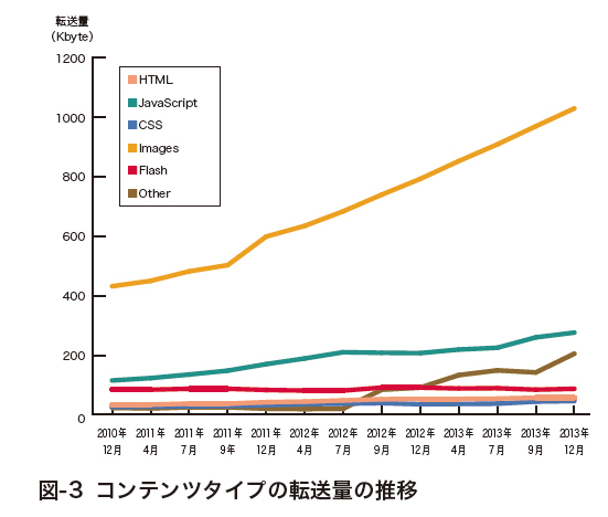 では、このコンテンツタイプの比率も、一般的なWebアプリケーションと比べるとどうでしょうか。先程のHTTP Archiveのデータを用いて、2010年12月から3年間、平均的なWebアプリケーションのコンテンツタイプの比率(転送量)を図-3に示しました。この3年間で画像とJavaScriptの転送量が2倍以上に増えてきていることが分かります。そして、図-2の結果と同様に、図-3でも画像の占める割合が一番大きく、2番目にJavaScriptが占めていることが分かります。