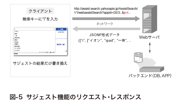 サジェスト機能は、途中まで入力された検索語に対して、その語に続く検索頻度の高い検索語を補完表示してくれます。図-4に、Yahoo検索で「IIJ」を検索したときの、サジェスト機能の結果を示しました。「I、I、J」と入力語が増えるたびに、それぞれ異なる補完結果が表示されていることが分かります。サジェスト機能はその性質上、高速に補完結果の表示が行われることが期待されています。どのようにして高速に補完結果を表示しているのか、その仕組みを知るために、サジェスト機能が利用されているときの、HTTPリクエストとレスポンスを見ていきます。図-5に示したように、検索語の入力フォームに「I」が入力されると、ブラウザは、図の上部に示したようなURLに「p=I」というクエリを含んだHTTPリクエストを、Webサーバに対して1つ送信します。このリクエストに対するレスポンスとして、Webサーバはサジェスト機能で表示する保管結果のデータを、JSONP形式のデータとして返します。ブラウザはこのデータを、事前にWebサーバから取得していたJavaScriptで処理することで、検索語に対する補完結果部分だけブラウザで再描画します。図-4の一文字目の例では、図-5のように小文字の「i」に続き、「イオン、ipad、一休、..」のようなデータがブラウザに返ってきました(2013年11月4日の結果)。このように、検索語のサジェスト機能では、必要なデータだけをやり取りするための最小限のHTTPリクエストとレスポンスと、受信したデータを用いた部分的なブラウザの再描画により、高速にサジェスト結果の表示を可能にしています。