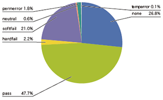 この利点もあり、SPFの導入率は、図-4をみても分かるとおり、非常に高い割合になっています。送信側でSPFを導入している割合は、認証結果が「none」(認証できなかった)以外の割合となり、今回の調査期間では73.2%でした。認証結果「pass」(47.7%)は、正しく認証されたメールの割合を示します。「hardfail」(2.2%)と「softfail」(21.0%)は、認証が失敗した割合となり、これらはドメインが詐称されたか、メールが転送などにより配送経路が変わって認証できなかったことを示します。