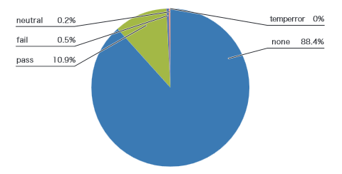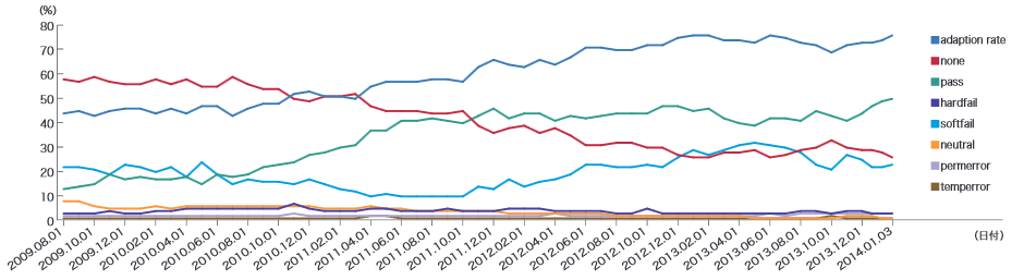 Gmailを提供しているGoogle社が、2013年12月に発表し たデータ(※7)によれば、Gmailが受け取ったspam(迷惑メール)でないメールの91.4%がSPFあるいはDKIMで認証可能であった、と報告しています。本レポートで示している送信ドメイン認証の結果割合は、受信できたメール全体を対象にしているので(迷惑メールも含んでいる)、Google社の報告とは、元になったデータの性質が異なっているので、単純には比較できませんが、かなり高い割合でした。