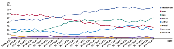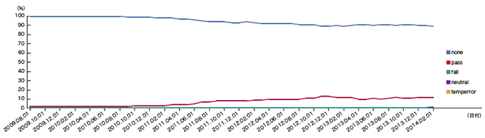 送信ドメイン認証技術には、メールの送信元のIPアドレスを元に認証するSPF(※5)と、メールの本文から電子署名を作成し、それを検証することによって認証するDKIM(※6)があります。それぞれの技術について、送信側の導入状況を図-4、図-5に示します。これは、IIJの主要なメールサービスで、2014年1月〜3月の間に受信したメール数に対する受信認証結果の割合を調査したものです。