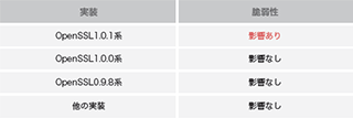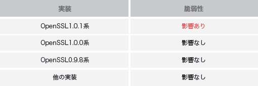 この脆弱性は、2014年4月7日にOpenSSLのセキュリティアドバイザリ(CVE-2014-0160)(※49)として公開されました。系列ごとの影響の有無を表-1に示します。この脆弱性の影響を受けるOpenSSLのバージョンは、1.0.1以降のみでした。クライアント、サーバ実装の組み合わせに関わらず、該当バージョンであれば脆弱性の影響を受けました。