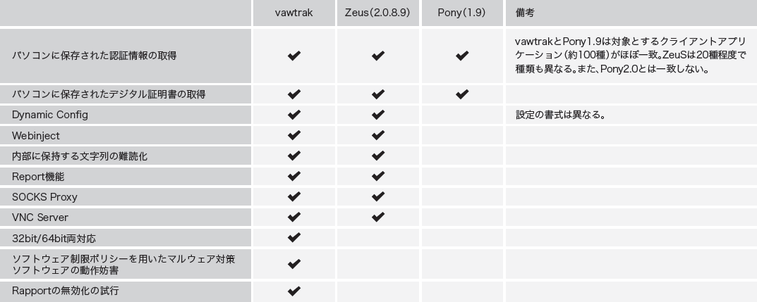 その他に、ZeuS、Ponyとは異なる機能として、ソフトウェア制限ポリシーを用いてマルウェア対策ソフトウェアを妨害する機能や、Rapport(※67)の無効化を試みる機能などを備えていました。vawtrakと、ZeuS、及びPonyとの機能の対応をまとめると表-3のようになります。
