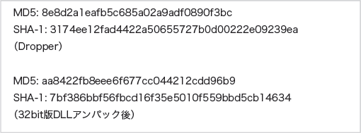 Dropperは削除されてしまいますが、ドロップされたdllファイルや自動起動のレジストリエントリは比較的容易に見つけられるため、本検体感染のインジケータとして利用することが可能です(※64)。