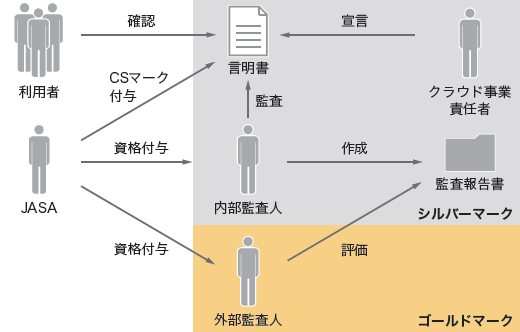 本監査制度ではこの2段階の仕組みを取り入れることで、クラウドサービスに関する技術情報の正確な判断と、正確な監査手続きを、可能な限り低コストで両立させようとしています。コストを抑えることでより多くのクラウドサービスが本制度に対応可能となります。J-CISPAでは内部監査人により監査された言明書にシルバーマーク、その結果が外部監査人により検証された場合はゴールドマーク、という形でマークを発行します。2013年度に、協議会のクラウドサービス事業者各社が「パイロット監査」として、この仕組みを試行しており、今年度は、この結果を元に本監査を行うべく、精力的に準備が行われています。