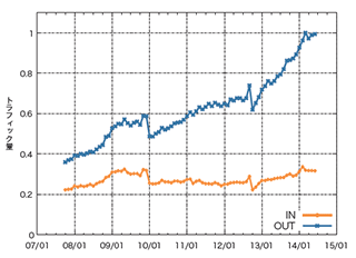 図-1は、IIJのブロードバンドサービス全体の過去7年間の月平均トラフィックについて、最大値を1として正規化して示したグラフです。2010年1月のトラフィック減少は、2010年1月に施行された改正著作権法、いわゆるダウンロード違法化の影響だと考えられています。それ以降、ダウンロード量(OUT)が増えている一方で、アップロード量(IN)は横ばいとなっていて、P2Pファイル共有のトラフィック割合が減っていることが窺えます。2012年10月には、違法ダウンロードの刑事罰化を含む改正著作権法が施行され、その前後でトラフィックの増減が観測されました。それ以降、ダウンロード量は以前にも増して伸びていて、アップロード量も僅かながら増加傾向にあります。この1年のトラフィック量は、INは13%の増加、OUTは27%の増加となっています。