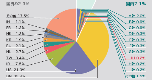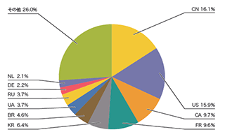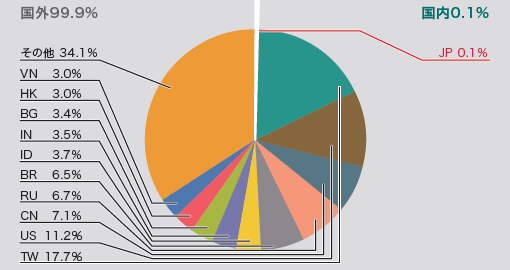 図-7 検体取得元の分布(国別分類、全期間、Confickerを除く)