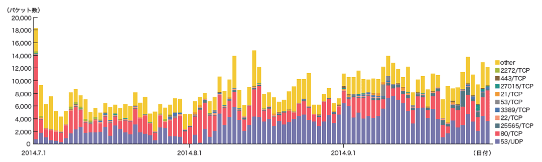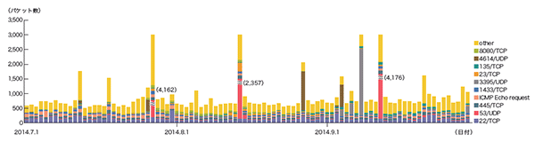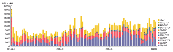 2014年7月から9月の間に観測したbackscatterについて、発信元IPアドレスの国別分類を図-3に、ポート別のパケット数推移を図-4にそれぞれ示します。
