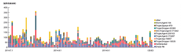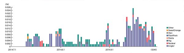 2014年7月から9月の期間は、4月から6月の期間に比べると、約2倍程度の頻度でドライブバイダウンロードが観測されています(図-12)。攻撃の内訳は、前期間と同じくAngler及びNuclearによる攻撃が多くを占めており、これらのExploit Kitは、いずれもJavaやFlash、Silverlightなどのプラグインの脆弱性を悪用する機能を備えています。特にAnglerは精力的に機能追加が行われており、8月下旬には感染時にクライアントのディスク上にマルウェアファイルを保存させないことでアンチウイルスソフトウェアによる検知の回避を試みる仕組みが確認されました(※42)。