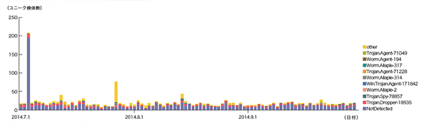本レポート期間中、Confickerを含む1日あたりの平均値は、総取得検体数が25,435、ユニーク検体数は672でした。短期間での増減を繰り返しながらも、総取得検体数で99.6%、ユニーク検体数で97.0%を占めています。このように、今回の対象期間でも支配的な状況が変わらないことから、Confickerを含む図は省略しています。本レポート期間中の総取得検体数は前回の対象期間と比較し、約20%減少しています。また、ユニーク検体数は前号から約7%減少しました。Conficker Working Groupの観測記録(※39)によると、2014年9月30日現在で、ユニークIPアドレスの総数は1,026,417とされています。2011年11月の約320万台と比較すると、約32%に減少したことになりますが、依然として大規模に感染し続けていることが分かります。