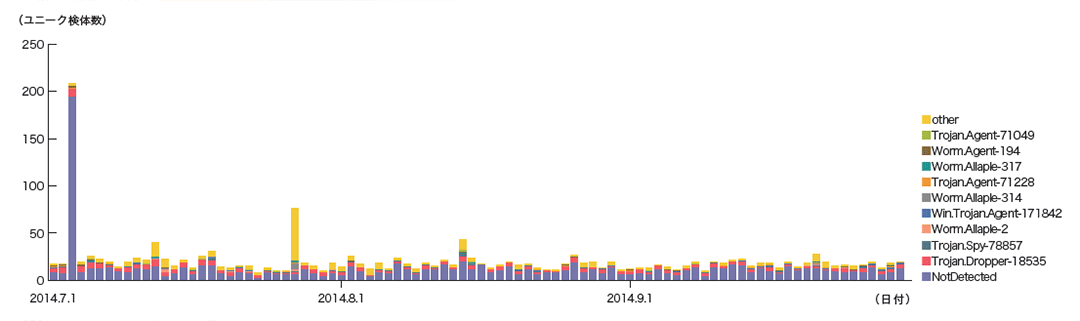 期間中の1日あたりの平均値は、総取得検体数が93、ユニーク検体数が20でした。未検出の検体をより詳しく調査した結果、シンガポールとフィリピンに割り当てられたIPアドレスからパスワードを盗み出すマルウェアなどが観測されました。また、未検出の検体の約54%がテキスト形式でした。これらテキスト形式の多くは、HTMLであり、Webサーバからの404や403によるエラー応答であるため、古いワームなどのマルウェアが感染活動を続けているものの、新たに感染させたPCが、マルウェアをダウンロードしに行くダウンロード先のサイトが既に閉鎖させられていると考えられます。
