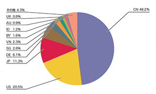 発信元の分布では、中国48.2%、米国20.5%、日本11.3%となり、以下その他の国々が続いています。Webサーバに対するSQLインジェクション攻撃の発生件数は前回に比べて大幅に増加しました。これは中国を発信元とする攻撃が大幅に増えたためです。