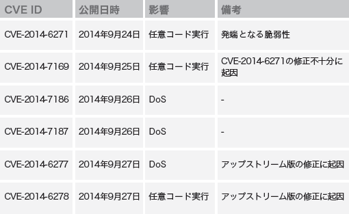 この脆弱性CVE-2014-6271(※44)は、2014年9月24日にBash(※45)の対策バージョンと共に公開されました。脆弱性の影響としてはリモートから任意のコード実行が可能です。Bashは通常ローカルで使用されるシェルプログラムであるため、リモートからの攻撃とは無縁と思われがちですが、その影響が明らかになるにつれて大きな騒ぎになりました。